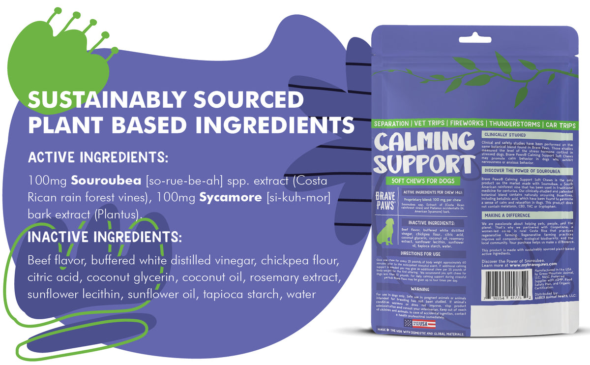 At Brave Paws, we care deeply about your dog’s comfort and well-being. Our unique Calming Support is the only product on the market that contains Souroubea, a natural ingredient known for promoting calmness in dogs. Our commitment to sustainable practices supports both the environment and the communities we source from. By choosing Brave Paws, you’re not just helping your dog’s emotional health; you’re ensuring they receive the love and care they truly deserve.